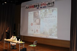 一般から団体、企業まで大好評だったこの講座!50名の定員オーバーの57名参加でした。チラシを作る際の、ポイントをわかりやすく講義して頂きました。