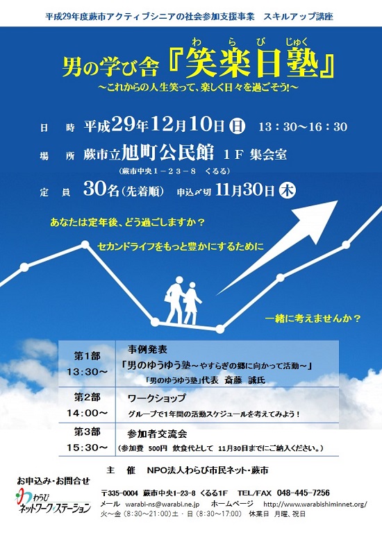 平成29年度のスキルアップ講座【男の学び舎「笑楽日塾」(わらびじゅく)】は開催終了しました。