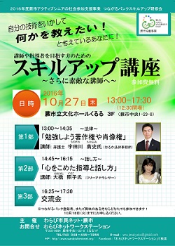 スキルアップ講座平成28年10月27日(木) 13:00〜17:30 蕨市立文化ホールくるる ●第1部●「勉強しよう著作権や肖像権」 講師:宇田川 高史氏 (弁護士) ●第2部●「心をこめた指導と話し方」 講師:大橋照子氏 (フリーアナウンサー) ●第3部●「交流会」 |